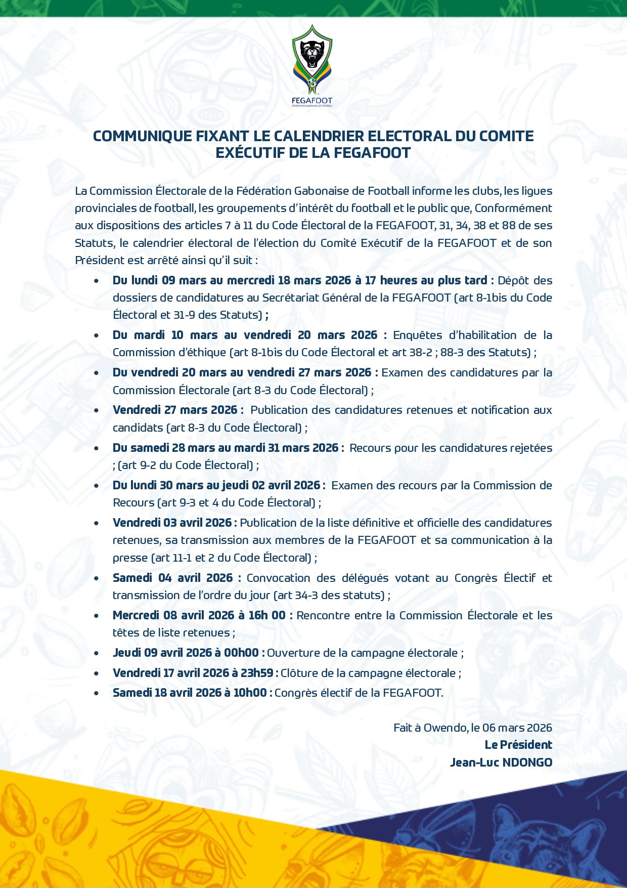La commission électorale de la Fédération gabonaise de football (Fégafoot) a officiellement dévoilé, le 6 mars dernier, le calendrier menant au renouvellement de son comité exécutif. Cette feuille de route très attendue par les acteurs du ballon rond précise notamment la période cruciale du dépôt des candidatures pour briguer la présidence de l’instance dirigeante du football national.